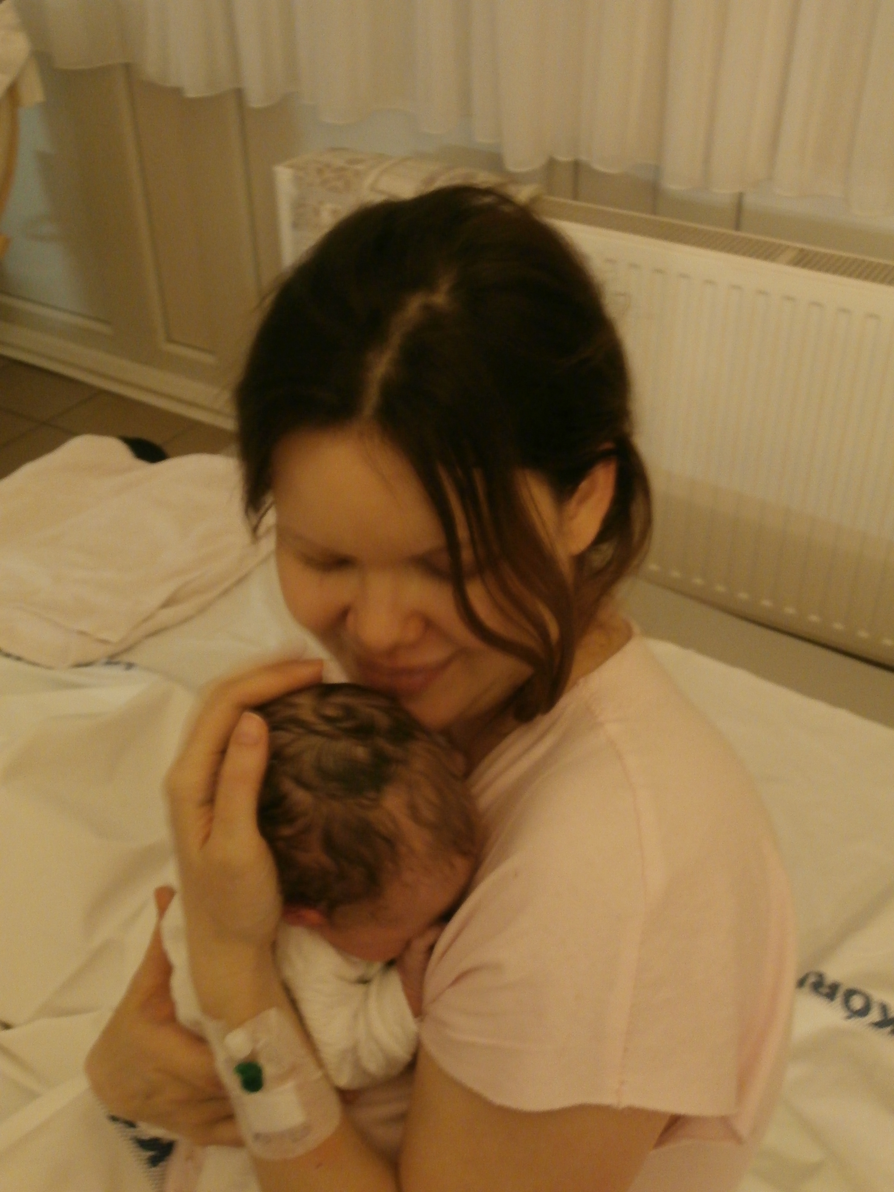 Három tolófájás és kibukkan a fejecske. Meglep a tempó, jutalom ez valamiért. Túlságosan észnél vagyok, azt hittem, tovább fog tartani. Szégyellem, hogy ennyit nyafogtam a végén. Még egy nyomás a szülésznőm kérésére, és kiforog a vállacska, és ott pislog előttem a matracon a kisbabám.