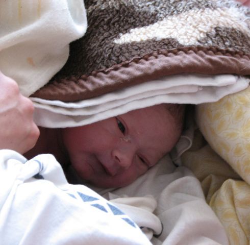 Ő egy kicsit kékes, lilás, de jól van, úgy néz ki. A bába tartja a karjában, figyeli még. Didereg szegény, még a hősugárzót sem volt idő bekapcsolni. Végre kicsit nyöszörög, jöhet a hasamra. Vééééégre! Ide vele! Gyorsan betakargatjuk, melengetem. Ő néz és mondja, mondja, mondja. Kár, hogy nem értem, mennyi mesélnivalója van!