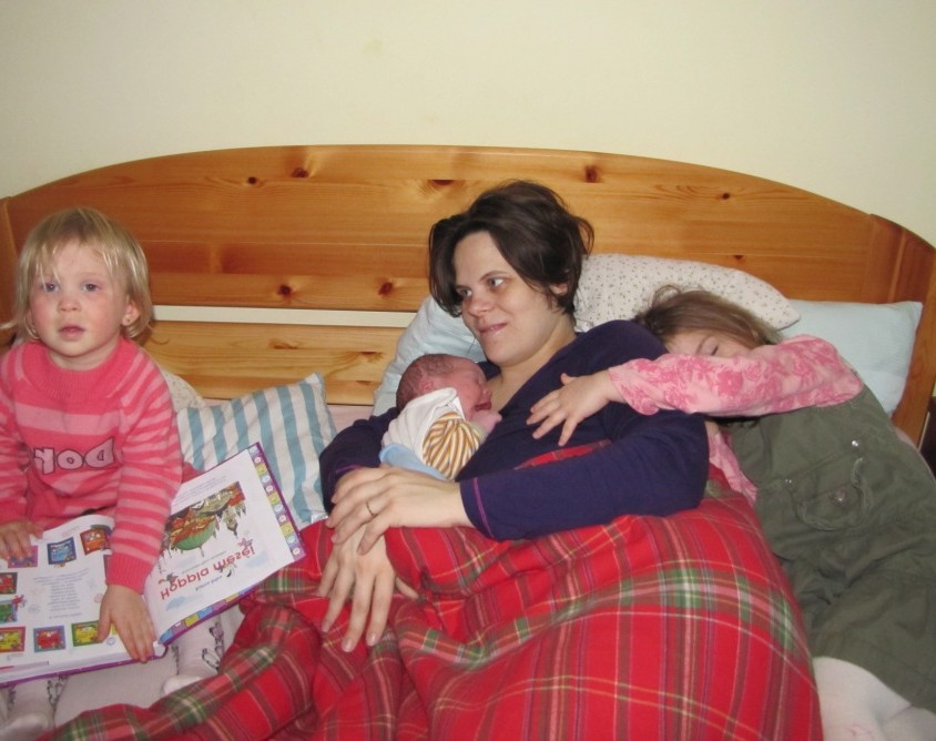 Lorka (négy és fél éves), Hanna (kicsivel múlt kettő) jelen voltak az öccsük születésénél, nekem ez nagy ajándék. Ajándék látni azt, hogyha nem tartod távol a gyermekeket az élet rendjétől (lásd születés és halál), akkor mennyire természetesen, helyénvalón kezelik a dolgokat. Természetesen most sem repedtem, így láthatták, hogy bár fájt Anyának, de utána a saját lábán ment lezuhanyozni, majd evett, ivott, minden ment tovább az élet rendes kerékforgásában.